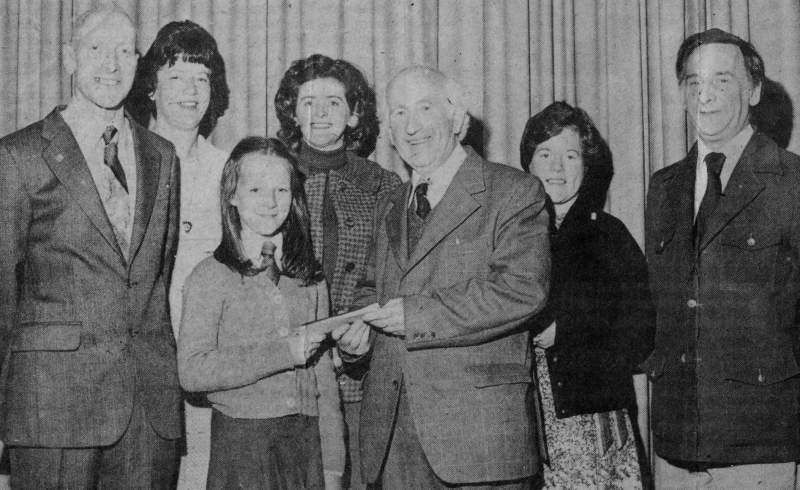 Jacqueline Campbell presents Mr. Graham with a wallet of notes. Others in the picture are Mr. Thomas Welch, principal; Mr. Derek Alien, vice-principal; Mrs. Margaret Clarke, senior mistress; Mrs. Pat Cochrane, head of the infant department, and Mrs. Nora McNally, secretary. E2301