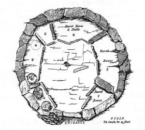 | '...they came across a broad, flat stone, which, upon being removed, proved to be the entrance to a tomb...Two boys who were in the field at the time, immediately descended into the place and examined it. !t is about six feet in diameter, and four in depth, and is nearly round at the base...Five slabs are placed as supports at equal distances round it, and in one of the compartments formed by them, was discovered an urn filled with bones, and three skulls, two of which are perfect; the third was, by accident, broken. From the appearance of the bones, it is evident that they had been burned previous to being deposited in the urn; but the skulls had been placed in the sand in their natural condition...' |
