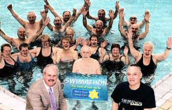 Councillor Thomas Beckett, Chairman of the Council's Leisure Services Committee at the launch of the 2012 Swimathon with Mr Phil Kane, Marie Curie Cancer Care and local swimmers who will be taking part in the 25th Swimathon as a team led by Mr Nevin Mitchell.