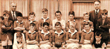 Largymore Primary School football team of 1961/62. They were the first team to win "The Double" without defeat in the entire season of the local primary school league. In fact they won every single match. The school were so proud of the achievement that they presented each player with a solid silver medal and organised a special lunch with a presentation at the school. The closest match was in the cup semi-final against Hilden P.S. who were winning 1.0 at half time but after a good talking to from Mr Ernest Shaw, school Principal and coach, they were able to turn this round and win 2.1. The team went on to beat Central RS. in the final by 3-1. Back row: Hugh McClurg, Ritchie Gorman, Albert Wilson, Robin Neil, Geoffrey Tait, Tommy Greer, Sammy Bittle, Davy Moore. Front row: Jim Keery, Billy McMullan, Eddie McNeil, Bill Higgins,capt. Bill Bruce, Jim Hanna and Willie Chambers.