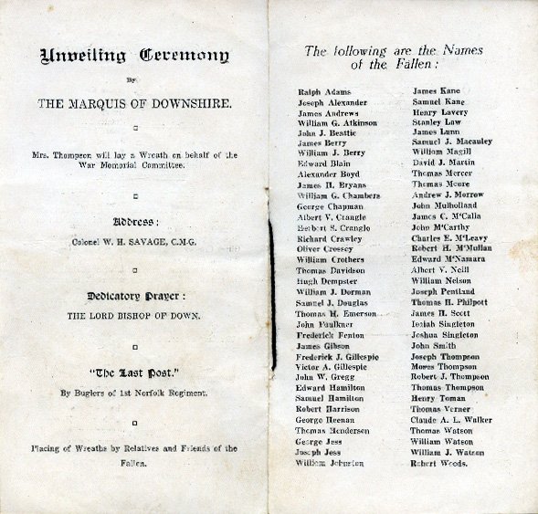 | Program cover of the Opening Ceremony of the War Memorial in Hillsborough (Courtesy of Robert Bell) |