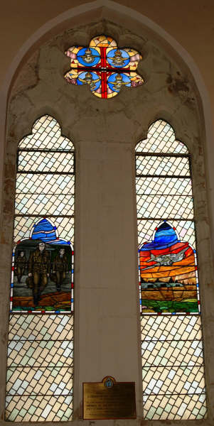 | Flt Lt Roy Kerr (OC 817 Lisburn ATC) pictured at the memorial window in Eglantine Parish Church. | The memorial window in Eglantine Parish Church. |