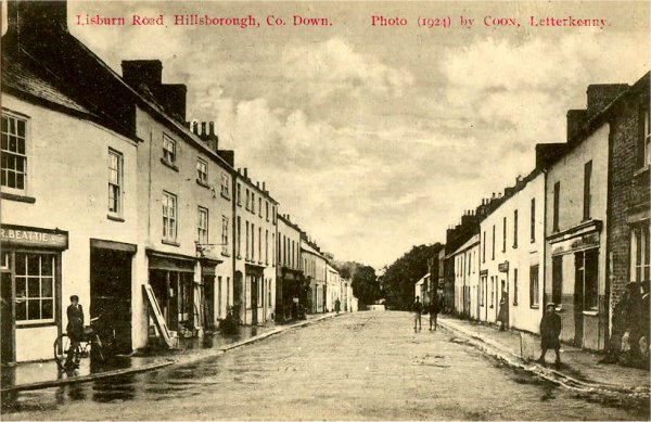 Lisburn Street Hillsborough on a 1924 Postcard by Coon, Letterkenny and another taken from roughly the same vantage point 60 years later, in 1984